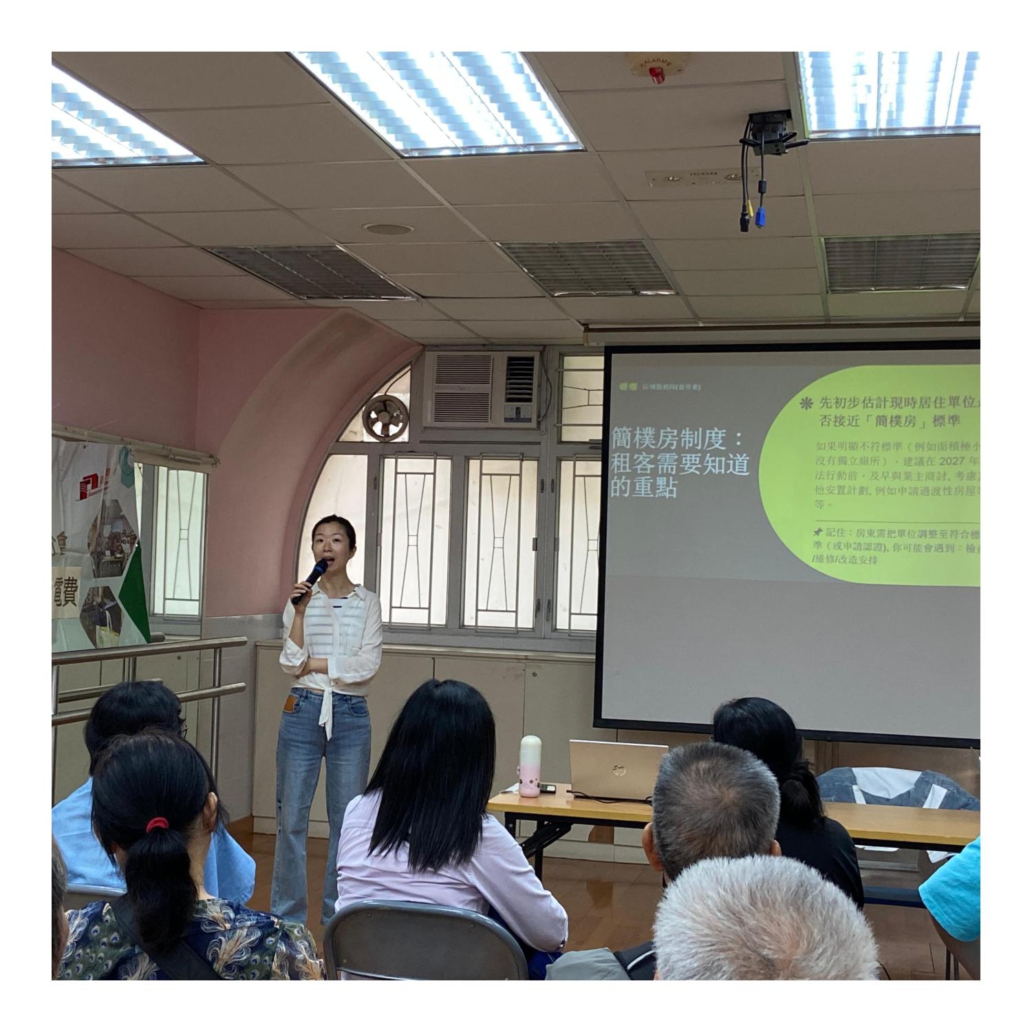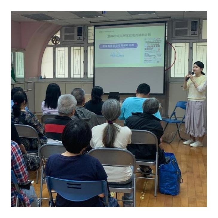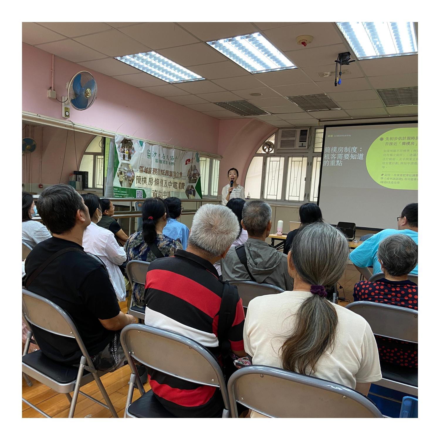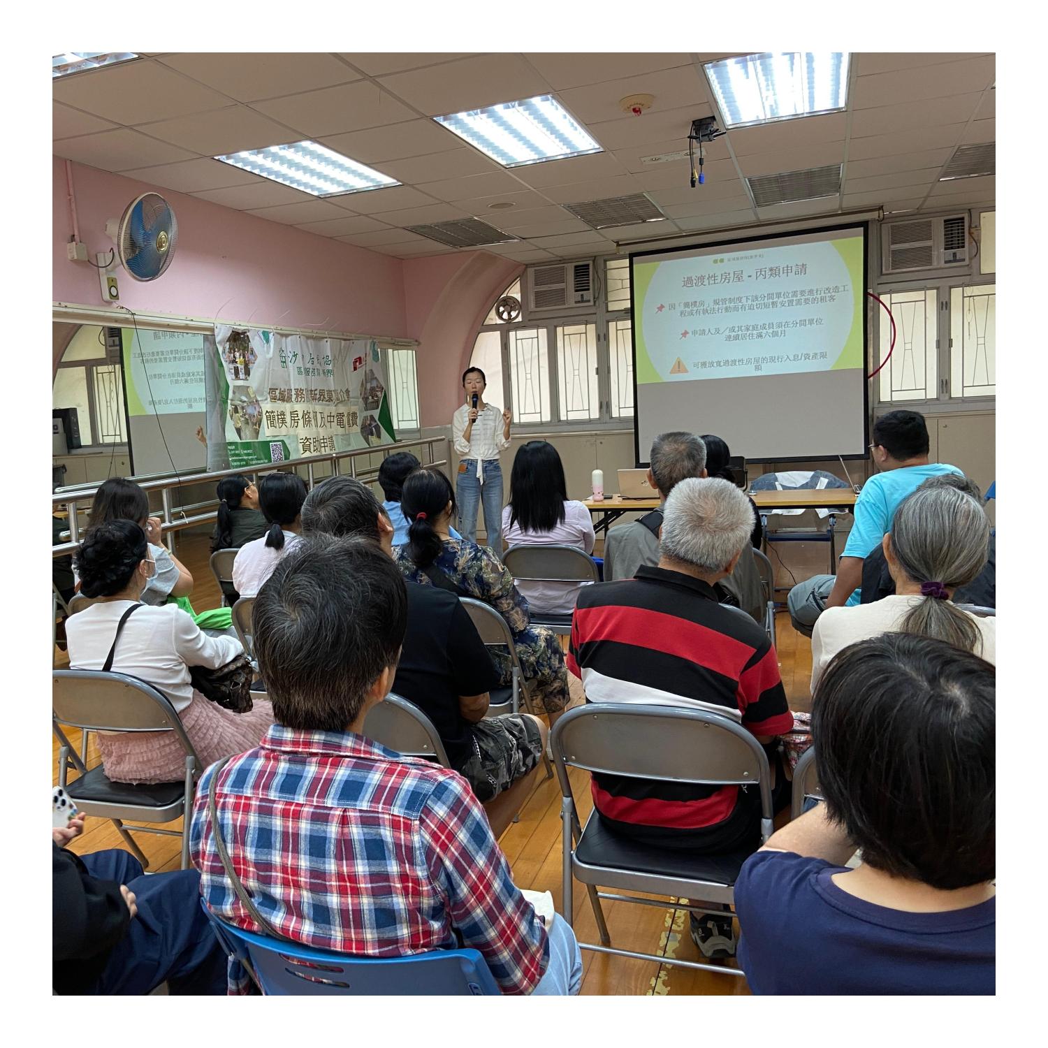 1.講解簡樸房條例內容及租客須知2.介紹過渡性房屋丙類申請3.中電電費資助申請